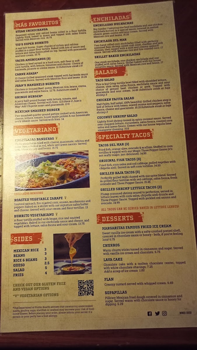 Vegetarian Option. Three enchiladas filled with cheese, guacamole, refritos and salsa fresca, baked in red, white and green sauces. Served with Mexican rice and beans.